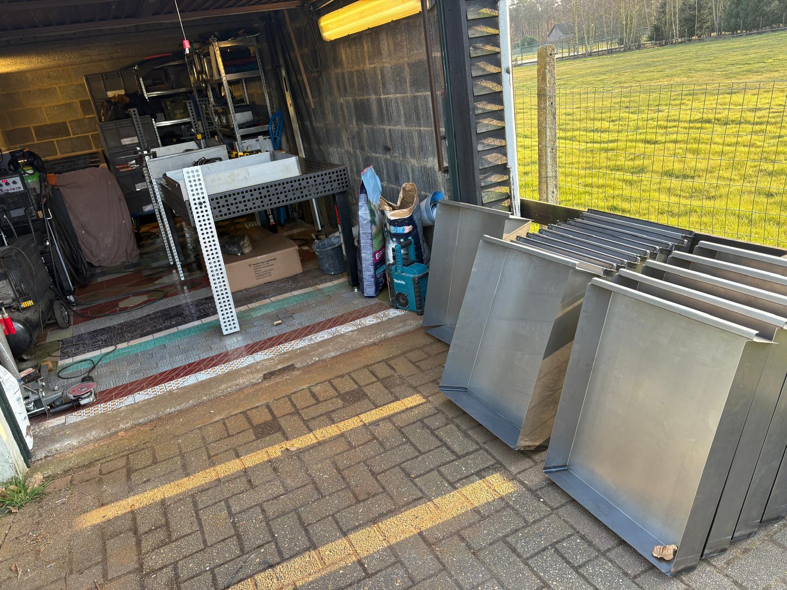 Deze ladebakken werden vervaardigd uit 1,5 mm staalplaat (S235JR), wat zorgt voor een sterke en duurzame constructie. De lassen werden langs de buitenzijde afgaand uitgevoerd om een volledige doorlassing te garanderen met een strak en esthetisch afgewerkte las. De combinatie van functionaliteit en afwerking maakt deze lades geschikt voor intensief gebruik in een industriële omgeving.